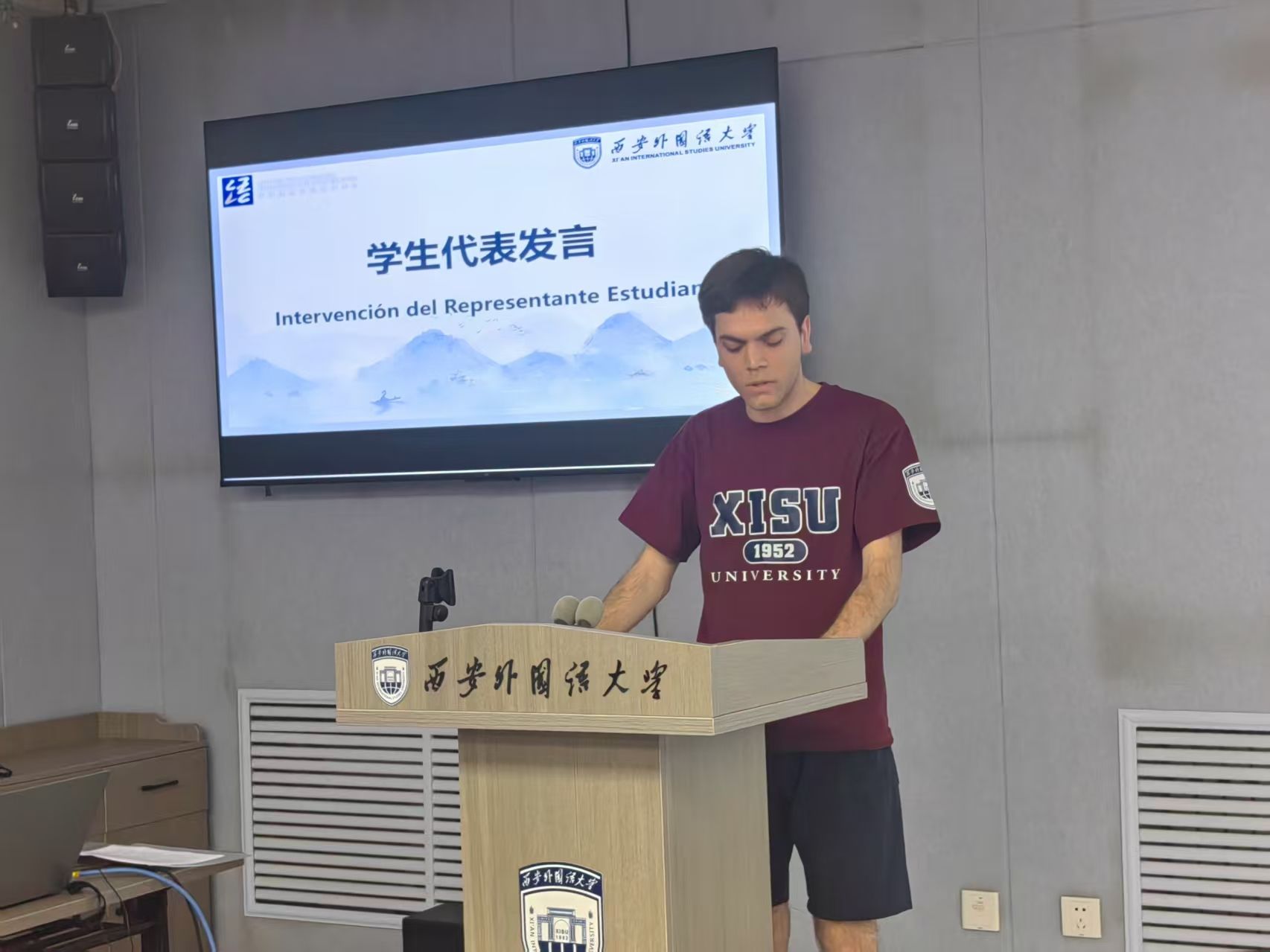 7月24日下午,2025阿根廷拉普拉塔国立大学孔子学院学生来华夏令营结营仪式在西安外国语大学雁塔校区图书馆报告厅举行。西安外国语大学汉学院·中亚学院副院长任韧、办公室主任张冰、夏令营领队于司童及全体营员共同出席了仪式。本次仪式由王俊英主持。