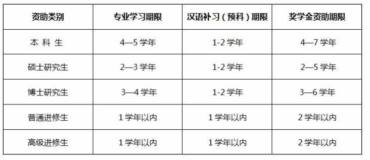 学习期限。包括专业学习和汉语补习(预科)的期限。