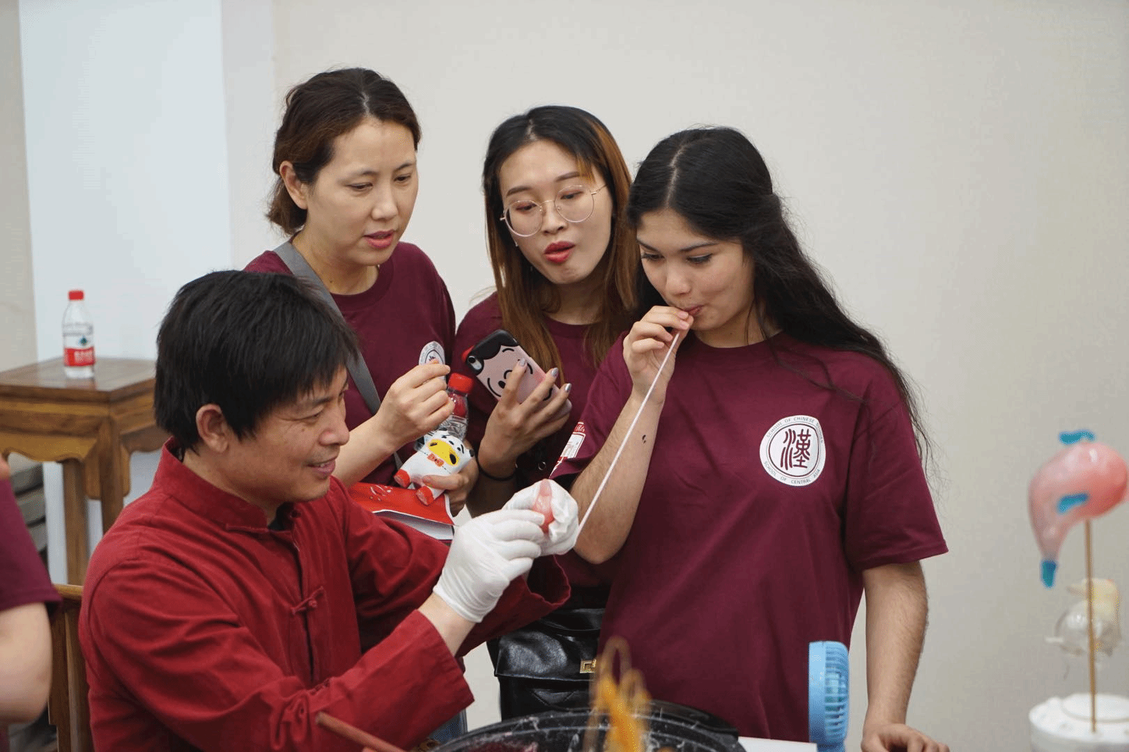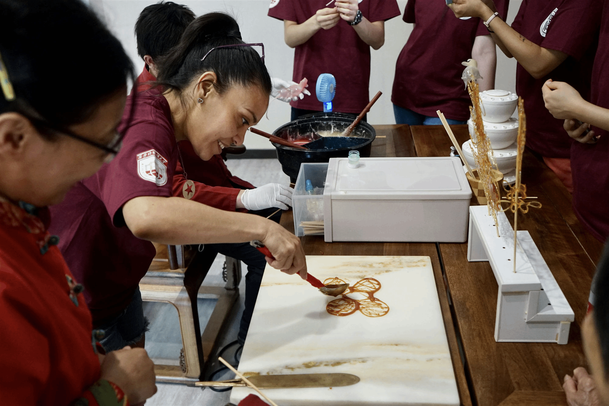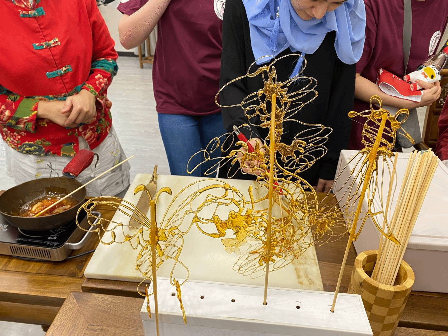 吹糖人 是中国民间传统手工技艺。制作者用一块融化的麦芽糖糖稀,通过揉、捏等动作,轻轻一吹,使其膨胀,再稍作修饰便可呈现出各类动物造型。学生可全程参与糖人儿的制作,在双方配合完成,糖人好看、好玩,还能吃。