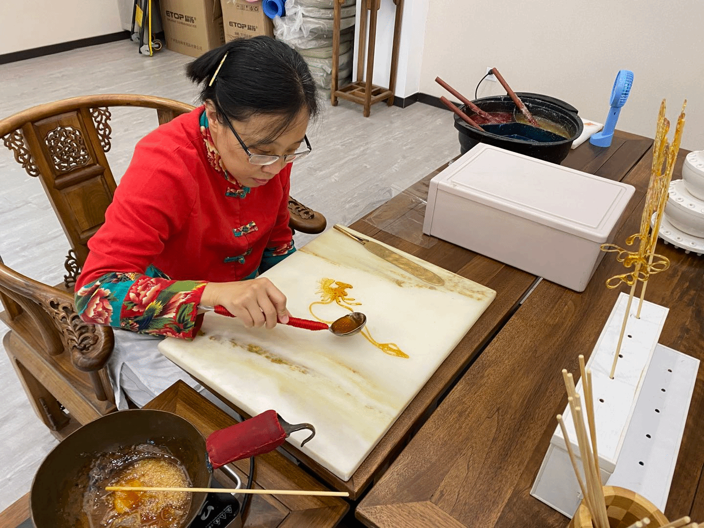 画糖画 是中国民间传统手工技艺,以糖为材料作画,可观可食,备受老百姓喜爱。做糖画的人没有底稿的,画稿全在他的头脑里,用勺舀起溶化了的糖汁,一气呵成。糖画晶莹剔透,既美观又美味。